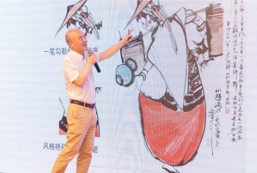 “這張作品是貫穿發老(程十發)一生的作品,他從連環畫轉型到中國畫,用寫我們少數民族的方法,在藝術市場上站起來了。”郭慰衆以程十發代表作《小河淌水》爲例解讀背後創作故事與藝術價值,並展示《小河淌水》1:1高清複製品,讓觀衆近距離感受大師筆下的民俗情趣與筆墨神韻。