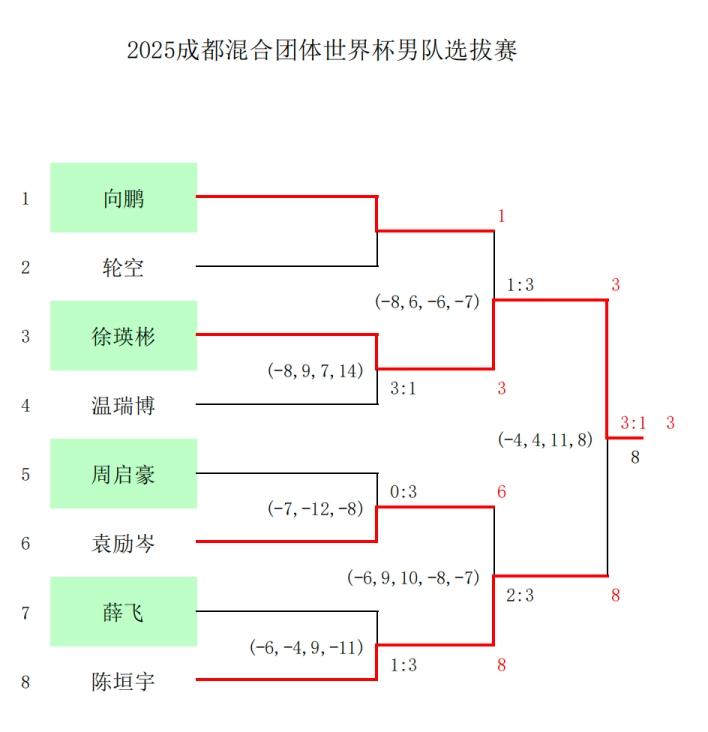 男隊王楚欽、林詩棟、梁靖崑直接獲得資格,徐瑛彬在七人蔘加的隊內選拔賽中脫穎而出。而去年陣容中的林高遠因個人原因選擇自願放棄本次隊內競爭。