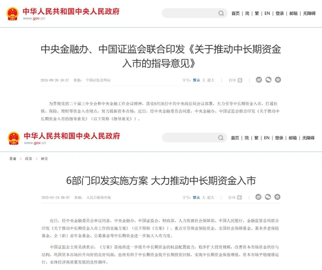 長期資金方面:2024年9月26日,證監會與中央金融辦聯合發佈《關於推動中長期資金入市的指導意見》,旨在打通社保、保險、理財等“長錢”入市的制度障礙。