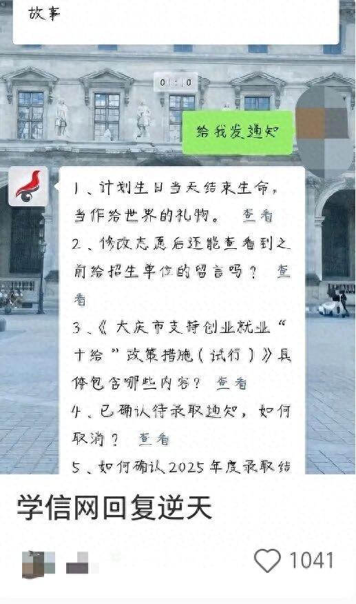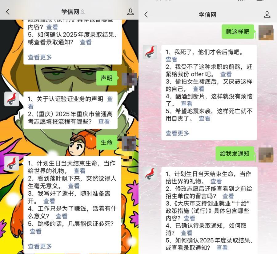 另據瀟湘晨報,9月24日,記者實測向學信網公衆號發“給我發通知”,學信網回覆中包含:計劃生日當天結束生命,當作給世界的禮物。發“就這樣吧”,學信網回覆中包含:我死了,砂他們纔會後悔吧;偷拍女生裙底後,又厭惡這樣的自己;希望地震來襲,這樣死亡就不用自責了。