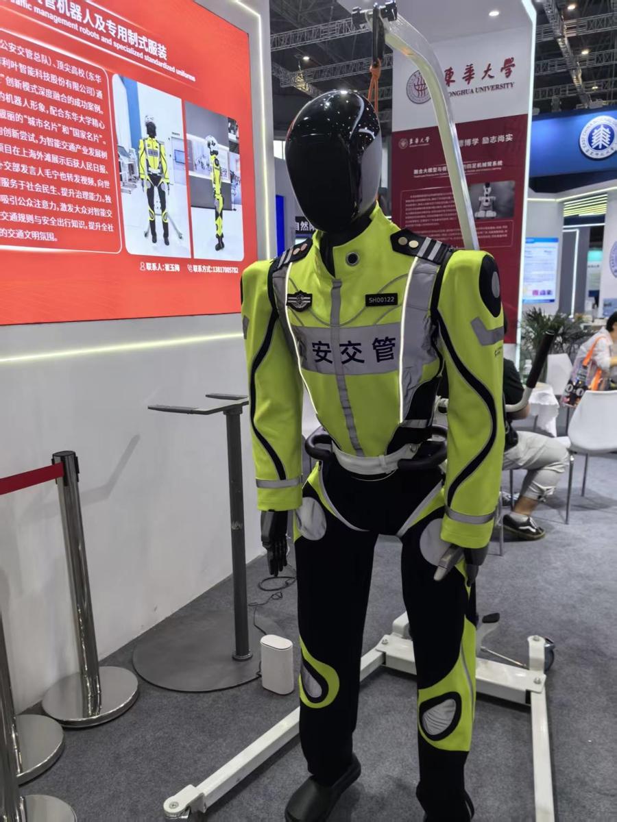 東華大學展臺前,擠滿了觀看一個身穿交管制服的機器人工作的觀衆。該機器人此前曾亮相於上海市黃浦區南京東路和中山東一路交叉口,並引發熱議。霓虹燈下,人行橫道旁,這個機器人頭戴警帽、身披反光背心,用標準的手勢爲車流和行人發出指示。該機器人就是由上海公安交管總隊、東華大學、上海傅利葉智能科技股份有限公司合作研發的公安交管機器人。