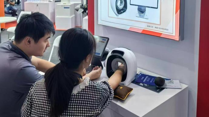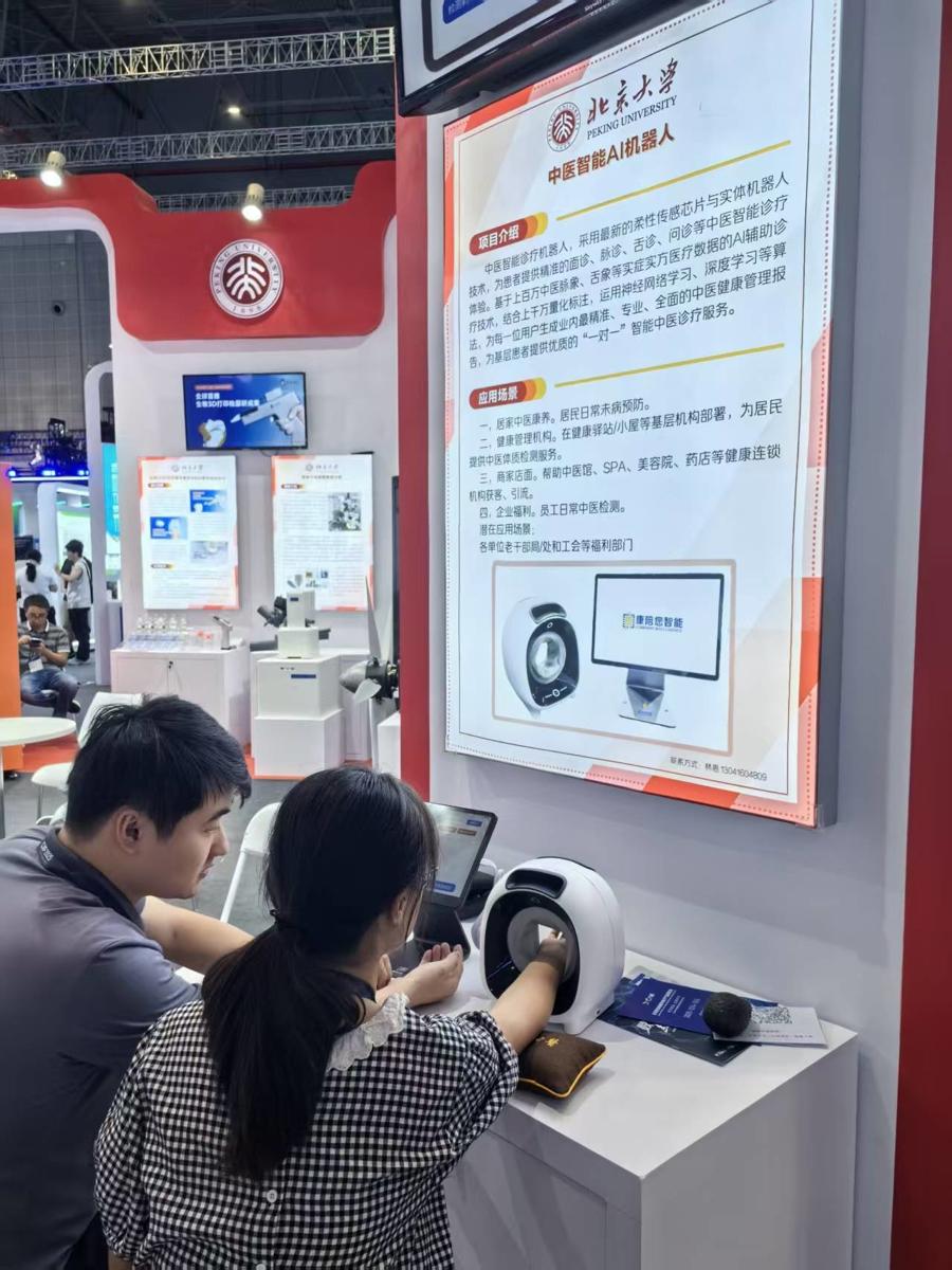 在工博會高校展區中,採用最新的柔性傳感芯片與實體機器人技術,爲患者提供精準的面診、脈診、舌診、問診等中醫智能診療體驗。北京大學基於上百萬中醫脈象、舌象等實證實方醫療數據,運用神經網絡學習、深度學習等算法打造了一款“中醫智能AI機器人”,它可以爲每一位用戶生成精準、專業、全面的中醫健康管理報告。該項目也引來了不少觀衆駐足。