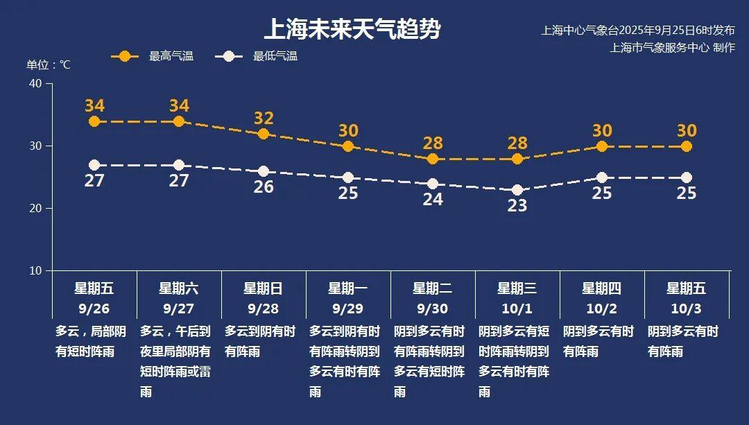 週五到週日,受副熱帶高壓影響,上海以多雲天氣爲主,有短時陣雨或雷雨,氣溫上升,預計最高氣溫在34℃附近。9月下旬上海這麼熱,還是比較少見的。下週,副熱帶高壓逐漸南落,上海在其北部邊緣,加上有弱冷空氣南下,陣雨天氣增多,氣溫回落。早晚相對舒適,最低氣溫在23~25℃,但是白天還不能完全涼快下來,最高氣溫仍可接近30℃。