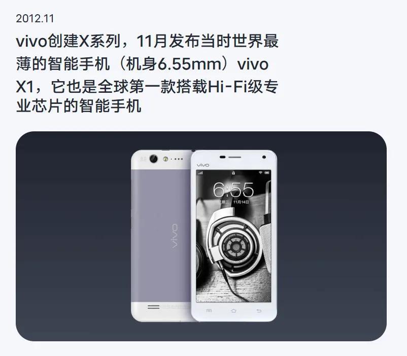 重壓下,vivo圍繞差異化和極致體驗進行智能手機開發,延續音樂基因,推出了vivo X1,它不僅成爲全球第一款搭載Hi-Fi級專業芯片的手機,同時也是當時世界上最薄的智能手機,機身厚度僅爲6.55mm。