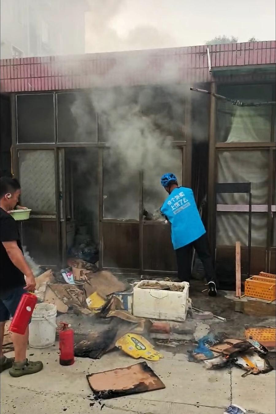 抵達現場時,濃煙已開始向樓道擴散,王建華一邊大聲安撫驚慌的居民“別慌!”,一邊憑藉冷靜的判斷,精準找到起火點,熟練拉開滅火器保險栓,對準火源根部持續噴射,動作一氣呵成、乾淨利落。短短几分鐘,初期火勢就被有效控制,火苗逐漸熄滅。待消防車抵達確認險情完全排除後,王建華悄然返回崗位繼續送單。