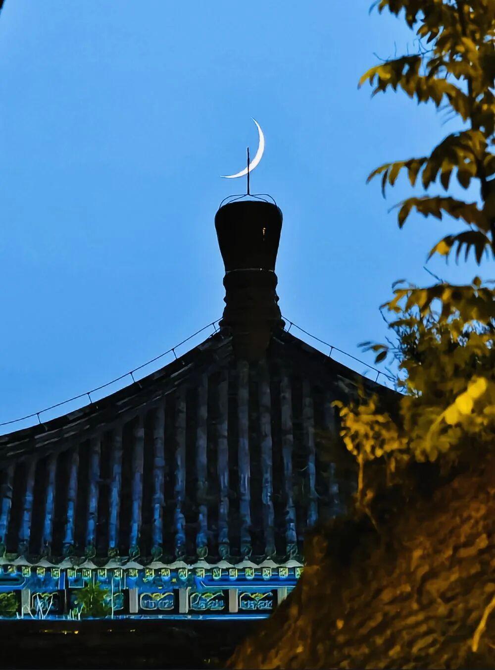 2024年8月7日,在北京北海公園拍攝的蛾眉月。(鍾奕 攝)