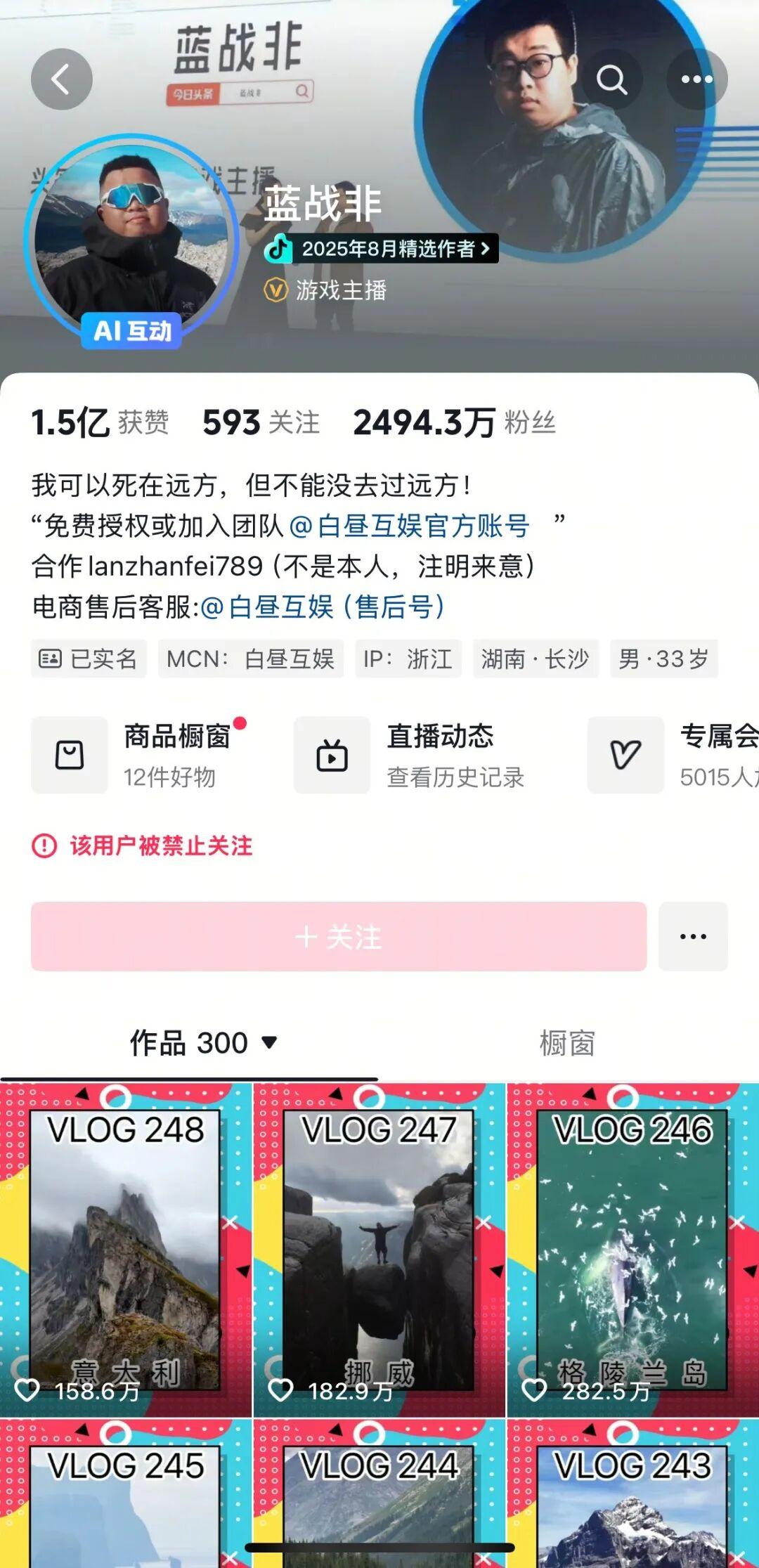 千萬粉絲網紅“藍戰非”,多平臺賬號被禁止關注,此前自曝年收入達九位數