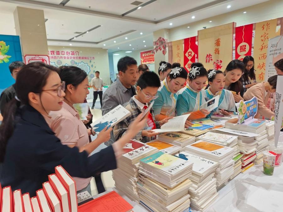 秋風揚起鸛河清波,文學伴隨西峽前行。西峽縣融媒體演播大廳裏,“文學‘縣’場,西峽‘友’約”等提示語是西峽讀者期待心情的表達。數家文學刊物展區內,書籍、文創琳琅滿目,不同年齡段的文學愛好者們興奮地排着隊,有穿校服的中小學生,還有穿演出服的當地演員加入其中,他們幾乎人手幾本新書,有的投入閱讀,有的與“友”互動,有的打開扉頁,等待熱愛的作家簽名……