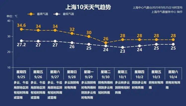 受副熱帶高壓影響,申城週六仍以多雲爲主,注意提防局部的陣雨或雷雨,氣溫在27~34℃。