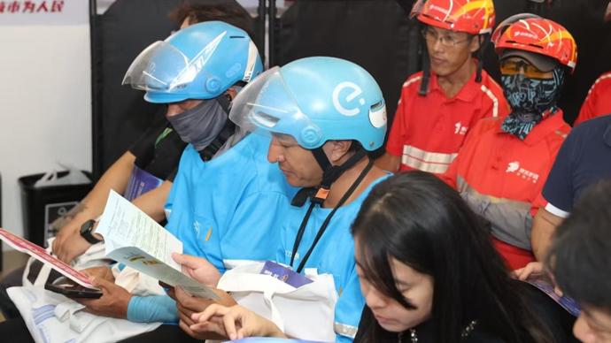 不僅送理論、送思想,還送文化、送政策、送服務。活動現場,主辦方聯合徐彙區多家平臺企業、街區共同發佈了 “騎手朋友圈”,通過政企社多方共建,爲快遞、外賣騎手提供從生活起居、安全出行到文化服務的全方位支持,建設好“暖心港灣”與“服務綠洲”。在騎士能量站周邊公共空間,提供免費理髮、機車維保等公益服務。市社聯還定製配送了“上海城市文化知識大挑戰”的理論市集競答活動,面向轄區內的郵政、閃送、順豐等平臺企業和快遞小哥、外賣騎手,普及上海城市發展、文化建設的豐碩成果,把理論民生、文化民生與生活民生整裝打包、直達基層,吸引了衆多小哥參與,提升新就業羣體的城市認同。