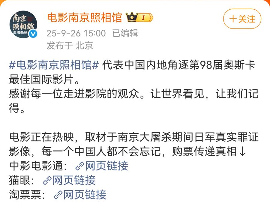 今悉,@電影南京照相館 發佈消息,《南京照相館》將代表中國內地角逐第98屆奧斯卡最佳國際影片。