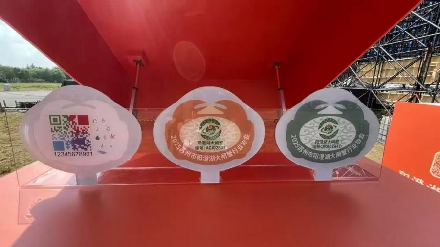 活動現場,2025年陽澄湖大閘蟹防僞標識(蟹扣、防僞標貼)也新鮮出爐。新一代防僞標識在延續“一蟹一扣”的機制上,今年還增加了“一箱一貼”的雙重防僞。湖區圍網養殖爲“蟹殼紅”,高標準養殖爲“蟹殼青”,標籤正面爲鐳射材料,反面二維碼根據邏輯變色顯示。打開微信掃描防僞標識二維碼可查看防僞信息,系統自動覈驗標識一致性後進入防僞溯源詳情信息頁面。