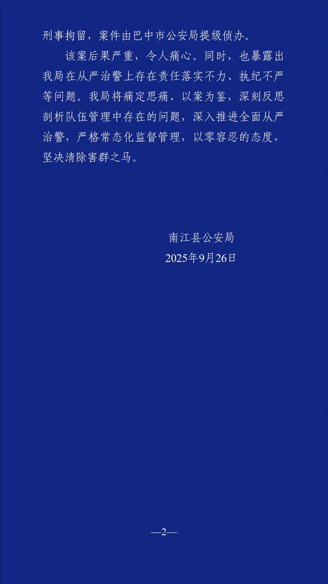 9月26日晚間,四川省南江縣公安局發佈警情通報: