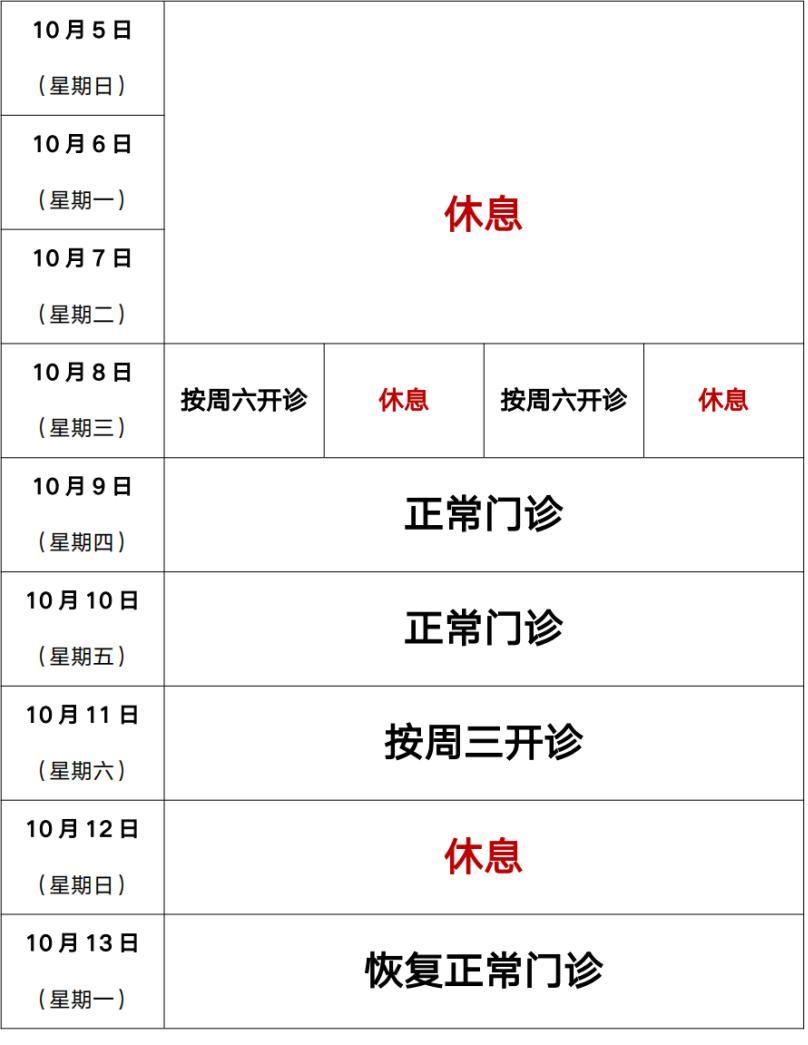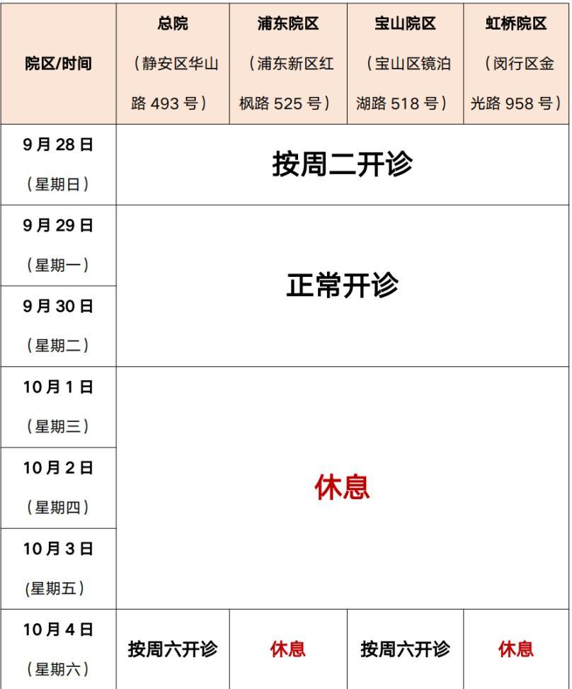 除此之外,復旦大學附屬中山醫院10月4日按週六門診開診,10月7日按週二門診開診,10月8日按週三門診開診;瑞金醫院10月7日、8日也是分別按週二、週三門診開診;上海市第一人民醫院10月4日、5日、7日、8日則分別對應週六、週日、週日、週六門診開診……