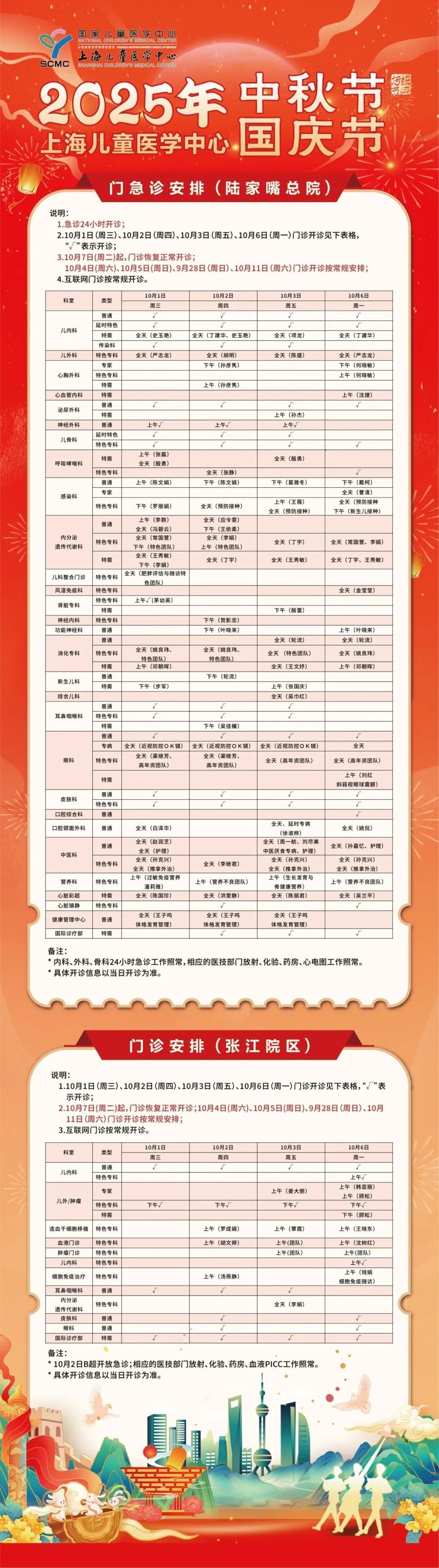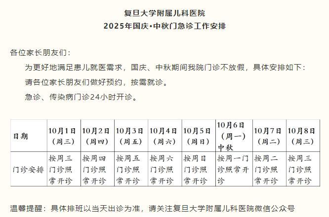 記者瞭解到,爲滿足學生的就診需求,復旦大學附屬兒科醫院與上海市兒童醫院8天長假無休,門診照常開診;上海兒童醫學中心10月1日至6日部分科室開診,7日起門診恢復正常。
