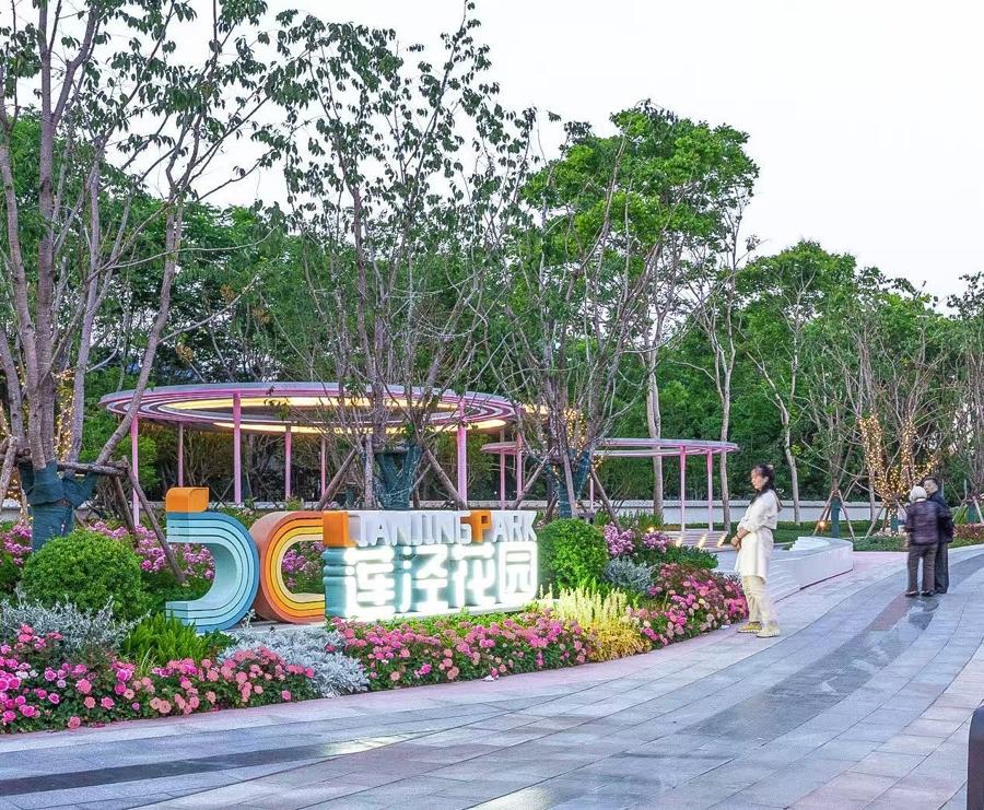 高科西路滬南路口袋公園,也就是蓮涇花園經過對地塊的重新設計劃分,以“蓮”爲“場”“溪”爲“徑”,多個“蓮瓣”形態的休閒場地與“溪涇”曲線的園路空間耦合,貫穿公園的泰克石坐凳和花壇融爲一體,與步道一同構成公園的慢行系統,東側廊架和西側木質鋪裝廣場形成各自區域內的休憩節點,給遊覽人羣營造“走走-停停-歇歇”的愜意體驗。