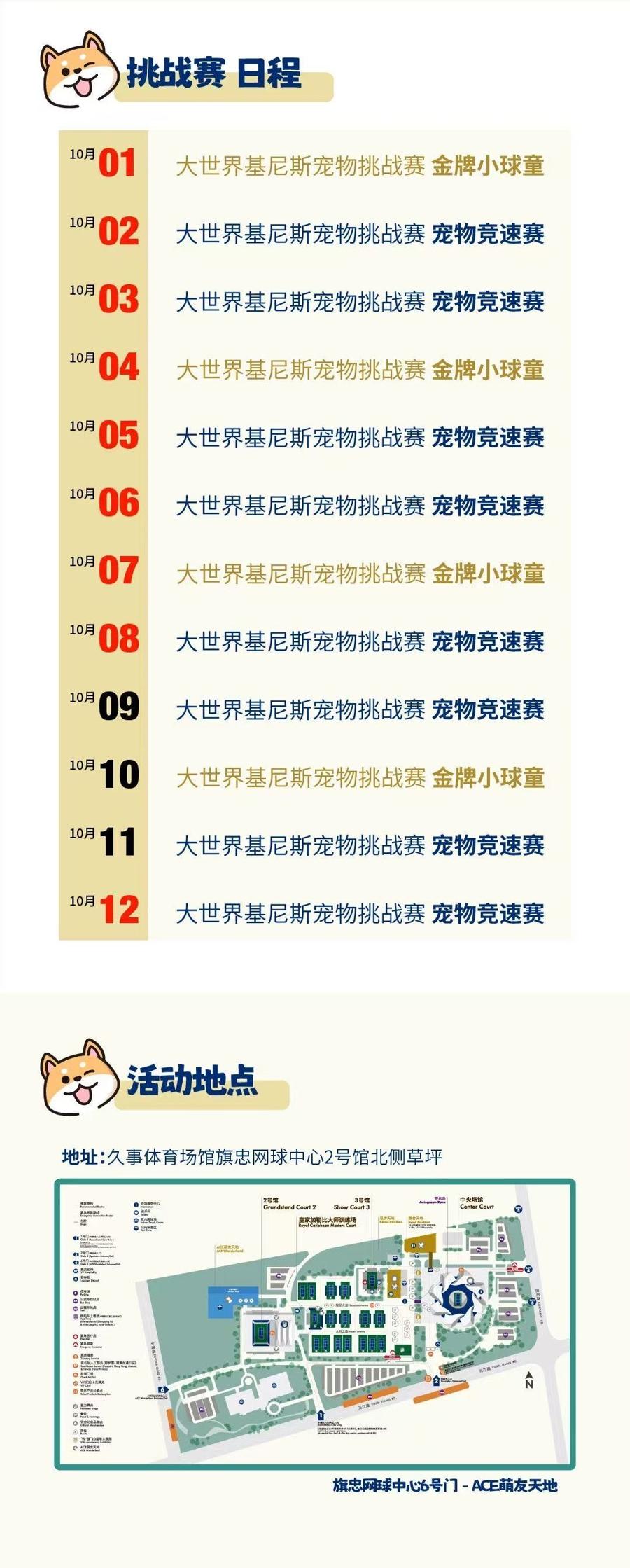 ACE萌友天地位於旗忠網球中心的2號館北側,佔地約7000平方米。專區內設有一個大世界基尼斯寵物樂園,面積達到3000平方米,每日最多可接待100只寵物犬。爲了確保寵物的健康與安全,專業醫生將全天候巡視,確保每一隻寵物都能在安全的環境中玩耍。