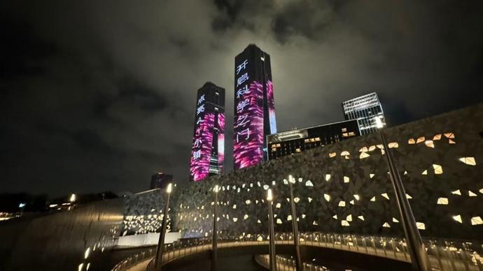 在張江科學之門雙子塔,一場沉浸式光影秀《星河啓明》以兩棟高樓的立面爲幕布,結合光影與科技,展現浦東創新創造、逐夢未來的精神。