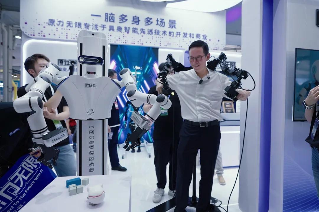 在一家成了不到兩年、名爲“原力無限”的杭州機器人公司的展臺上,吳老師先是被穿着馬面裙的機器人“算了一卦”,接着他穿上“機器衣”,對着空氣比劃着手,只見一旁的機器人按照吳老師的手勢,一點點把積木搭了起來。在宇樹科技的擂臺上,吳老師被裏三層、外三層的觀衆圍着,只見他擺起架勢,和穿着拳擊手套的機器人同臺競技。當機器人被擊倒後“裝死”幾秒又飛速起身,引得觀衆大笑。