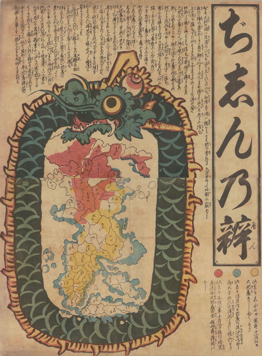 登場的“地震鯰”乃盤踞日本之龍蛇的變體或代替物。圖1是安政大地震後描繪日本列島的受災情況的瓦版地圖,其上依然是“大蛇”(龍蛇)盤踞島國。