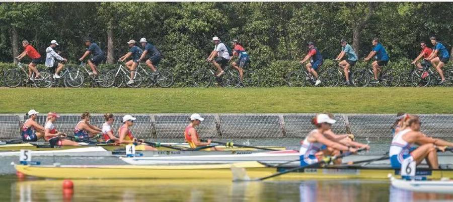 硬件設施是辦賽的底氣,覆蓋賽場調度與日常服務的賽事組織則處處體現着賽事的溫度。選手比賽時,教練需沿着航道動態跟蹤隊員的比賽進程,組委會貼心配備自行車,精準解決這一現場需求。