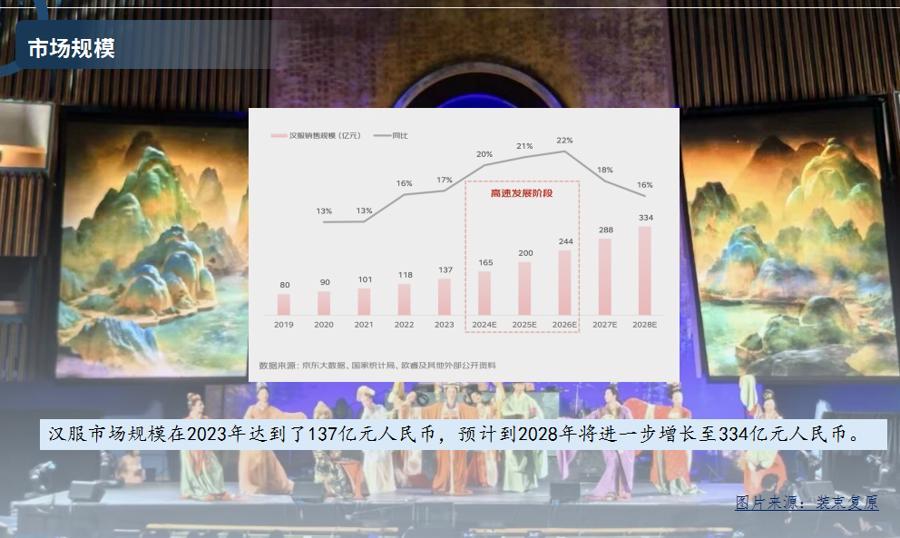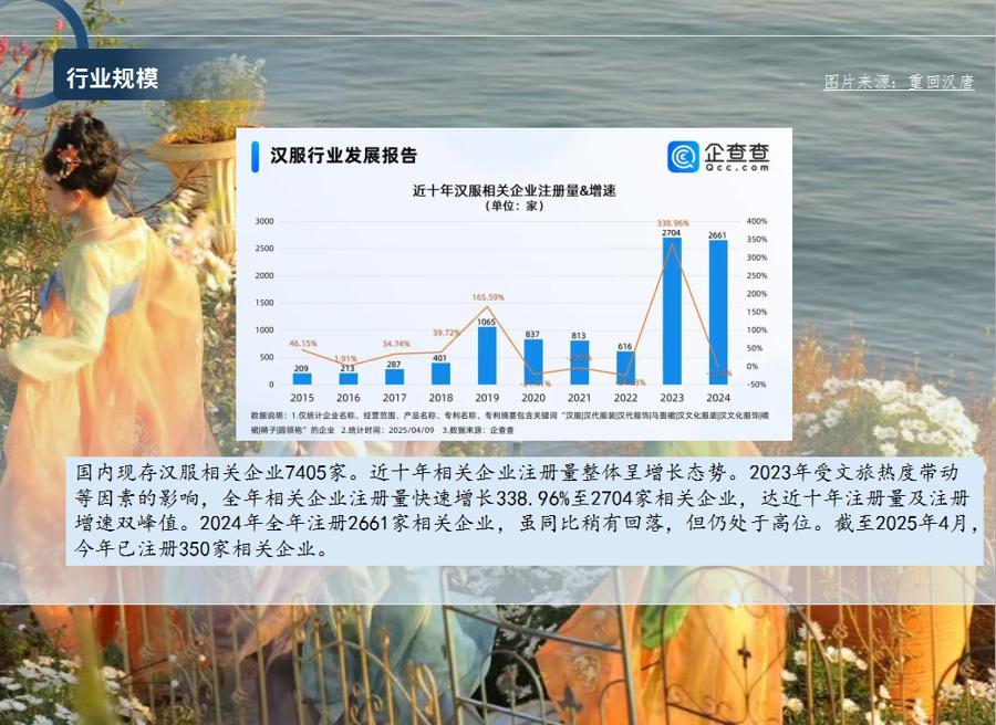 據不完全統計,漢服市場規模在2023年達137億元人民幣,預計到2028年將進一步增長至334億元人民幣。國內現存漢服相關企業7405家。近十年相關企業註冊量整體呈增長態勢。截至2025年4月,今年已註冊350家相關企業。