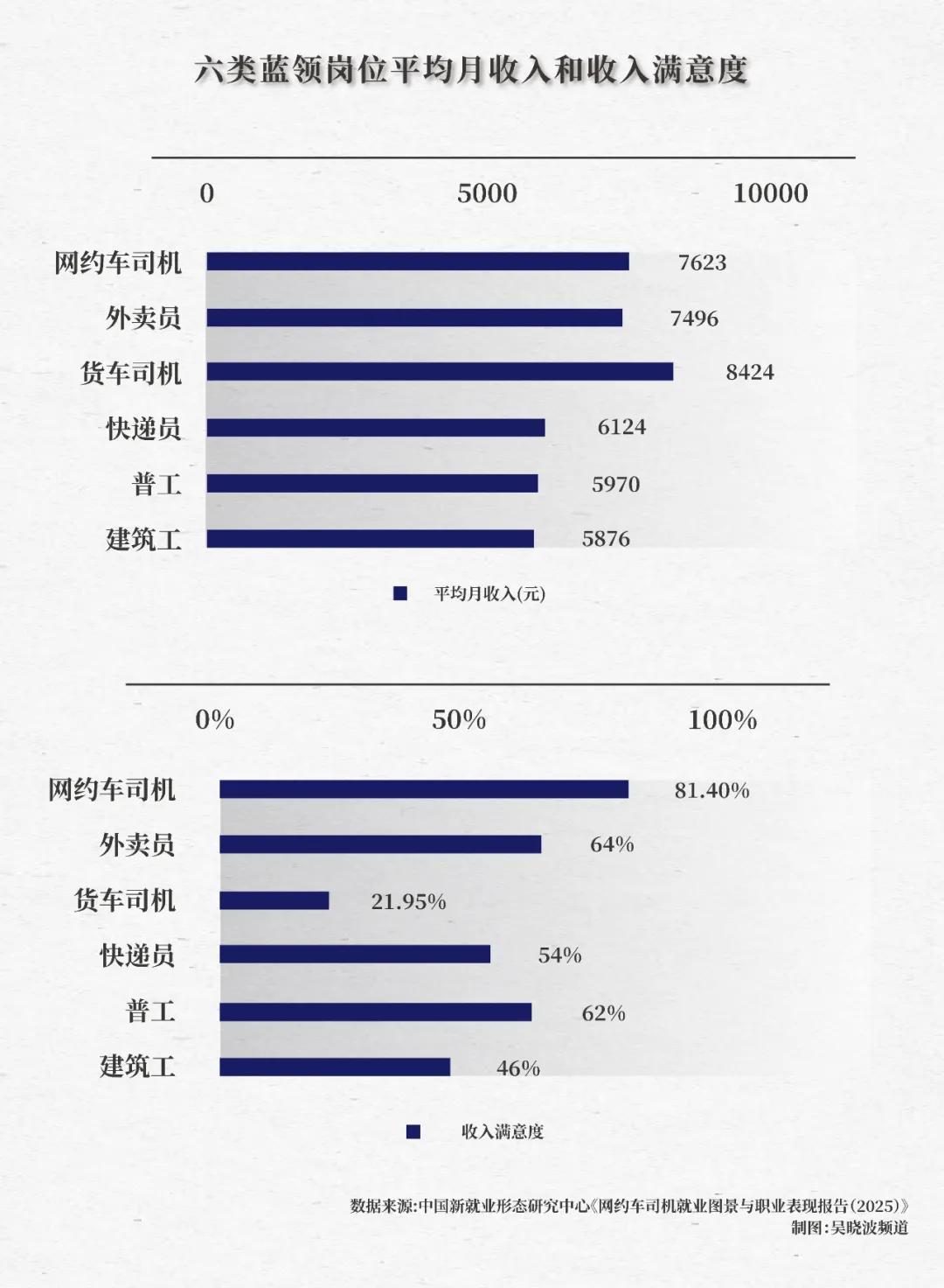 橫向對比看,在六類“新藍領”職業中,網約車司機以7623元的月均收入位列第二,而在一線城市,日均上線時間大於等於8小時的網約車司機月均收入爲11557元。