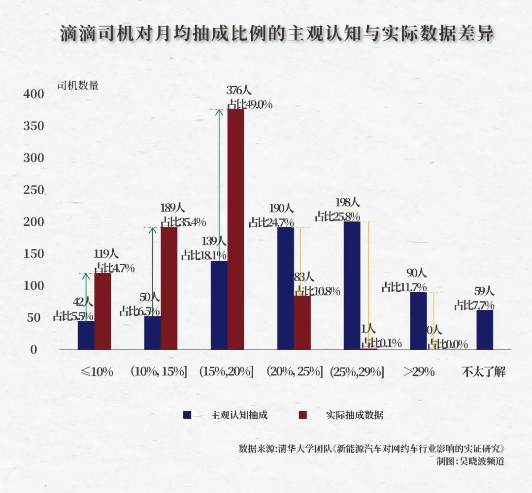 但清華大學環境學院發佈的《新能源汽車對網約車行業影響的實證研究》報告基於街頭調研發現:實測的全部滴滴司機月度平均抽成15.3%,九成司機月均抽成低於20%;71.8%的司機在問卷中高估了自己的抽成比例。此前,滴滴官方也對外披露,2024年平臺所有訂單平均抽成爲14%。