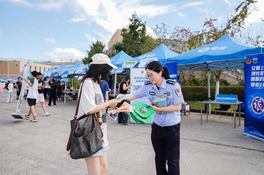 9月19日,反詐宣傳進一步深入校園。在相同指導與協助機制下,警方於華東師範大學社團巡禮現場設專門宣傳展位,面向新老學生追加發放反詐手賬本,並通過案例解析、互動問答等形式,持續普及防騙知識,呼籲同學們樹立正確網絡安全觀念,提高日常學習生活中的警覺性。