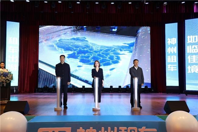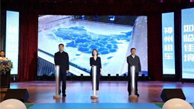 吉林省交通運輸廳運輸管理局副局長李乃龍(左一)、吉林省文化和旅遊廳公共服務處處長馮長國(右一)、神州租車副總裁林佳(中)共同啓動“如臨佳境”G331租車出遊發佈會