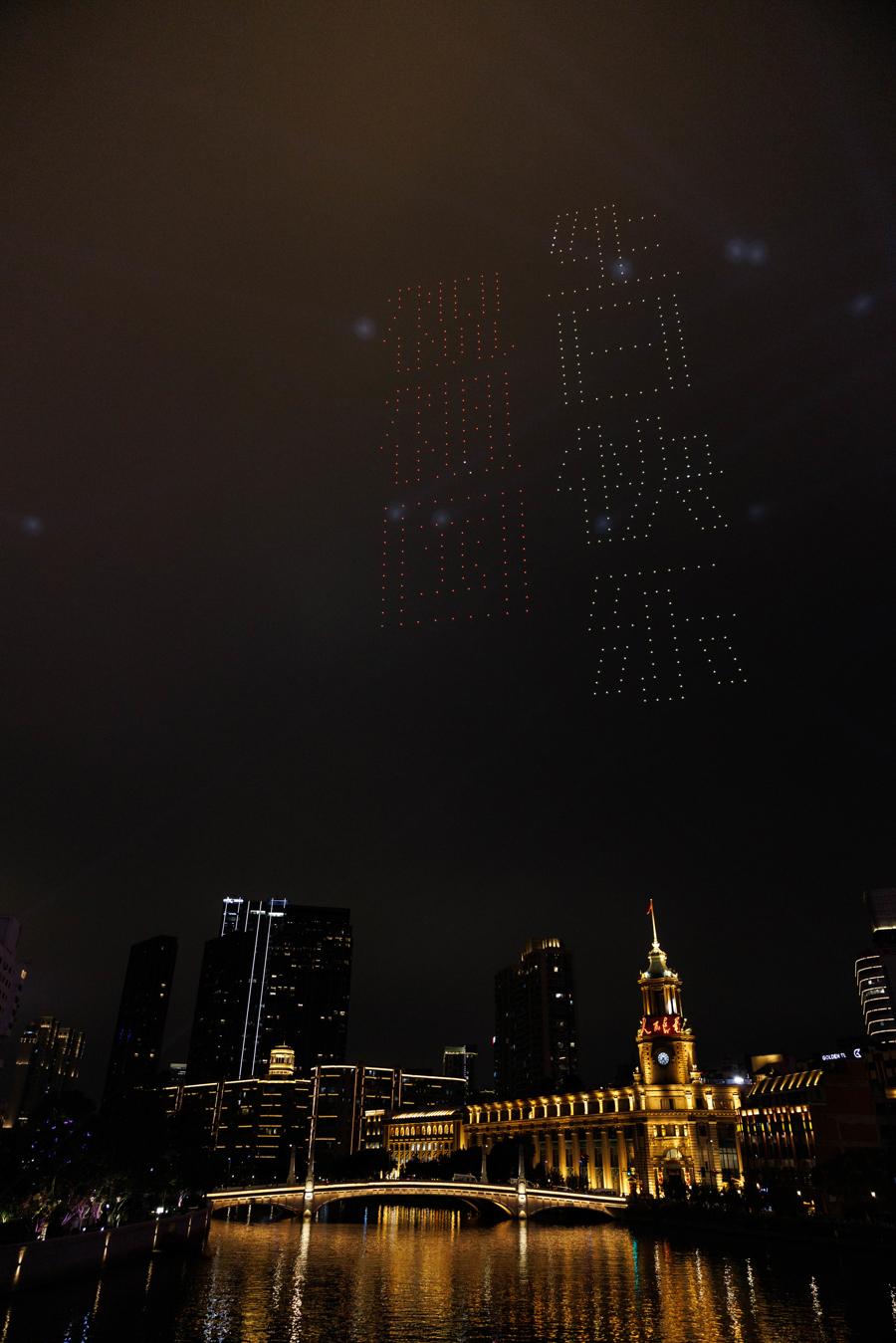 開幕式尾聲,500架無人機騰空而起,以科技融合藝術的方式,將現場氛圍推向高潮。無人機編隊依次呈現“HEAD OF SHANGHAI REGATTA”、疾馳賽艇造型、世界賽聯標識、東浩蘭生標誌以及“祝祖國生日快樂”等畫面,每一次變幻皆引來觀衆陣陣讚歎。這場點亮蘇河夜空的光影盛宴,既表達了對賽事的美好祝願,亦慶祝中華人民共和國成立76週年華誕,彰顯上海的開放、活力與深情。