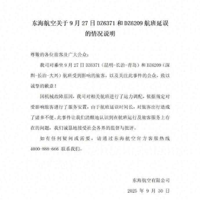 9月30日,東海航空發佈關於9月27日DZ6371和DZ6209航班延誤的情況說明:我司對乘坐9月27日DZ6371(昆明-長治-青島)和DZ6209(深圳-長治-大興)航班受到影響的旅客,以及關注此事件的公衆,致以誠摯的歉意!因機械故障原因,我司對相關航班進行了運力調配,依據規定對