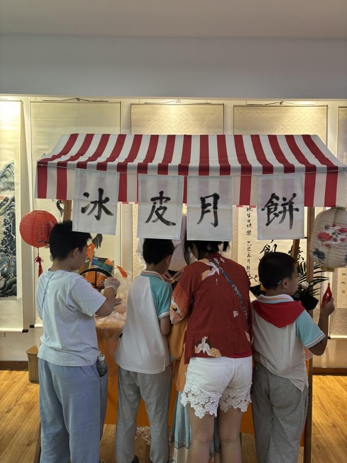 然後,只要拿着一張特製“遊園集章卡”,就可以去不同的攤位打卡體驗了。記者看到,這裏的互動體驗不僅有中秋節傳統項目——猜燈謎、中秋月餅DIY工坊;有拿捏秋日氛圍的桂香中秋插花體驗、茶道體驗、桂花粘土;也有“舌尖上的中秋”——桂花糖藕美食攤,大家爭相品嚐這道秋日美食,有的還動手體驗製作的樂趣;而在書法團扇創造工坊,國潮與團扇的結合,濰坊書畫社老師帶着大家共創獨一無二的書畫作品。