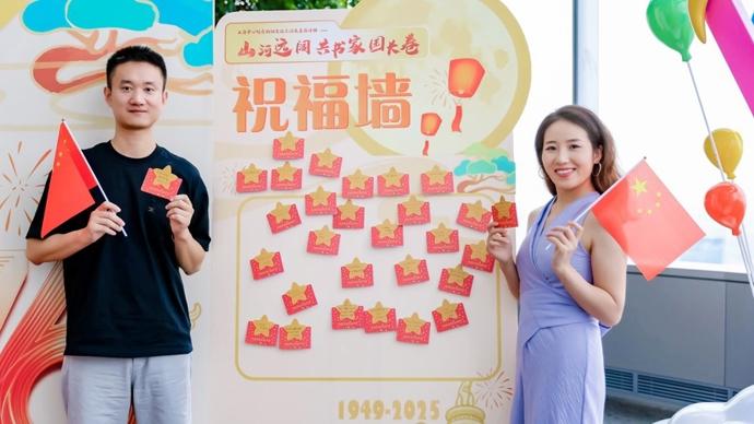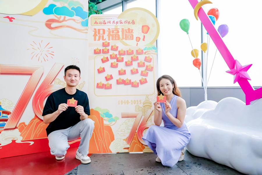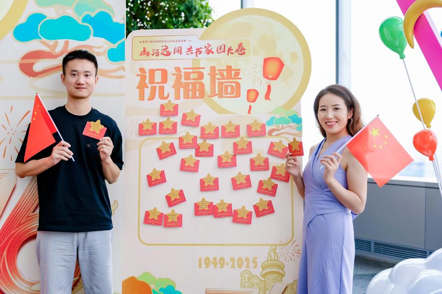 除了合影區,不少新人都領取了星星卡,認真寫下對小家和祖國的雙重祝福和期許,並貼到祝福牆 。一位剛寫完卡片的張先生笑着說:“我寫了‘願祖國繁榮昌盛,也願我們的小家溫暖如初’——國是大家的國,家是小家的家,都值得我們用心守護。”新人們星星點點的真摯祝福,匯聚成河,繪就了一幅飽含深情家國長卷。