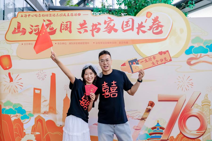 當天,全市婚姻登記機構同步開展“滬上同心 囍遇華誕”聯動活動。在標註上海17個婚登機構及城市地標的背景牆前,浦東新人手持國旗合影,並大聲說出愛的誓言。新人楊小姐表示:“從外灘到陸家嘴,從豫園到上海中心——這座城市見證了我倆從相識到相愛,今天又見證我們成爲一家人,特別有意義。”
