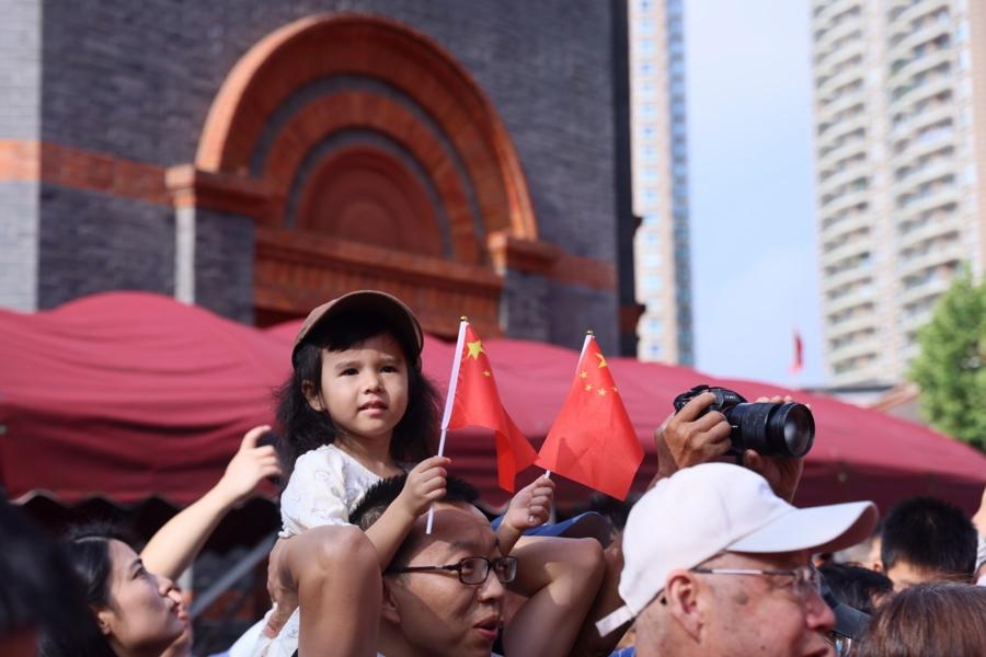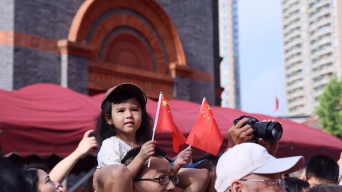 清晨的陽光灑滿中共一大紀念館前的廣場,在熙攘的人羣中,來自寧波的三年級學生蔣家豪格外引人注目。他穩穩地騎在爸爸的肩頭,目光專注。當雄壯的國歌聲響起,他立刻抬起手臂,敬了一個標準的少先隊禮。今年國慶,他們一家四口專程從寧波趕來觀看升旗儀式。他的媽媽是一位黨員,希望用這種特別的方式,讓孩子親身感受這莊嚴的時刻,將愛國的種子深植心中。