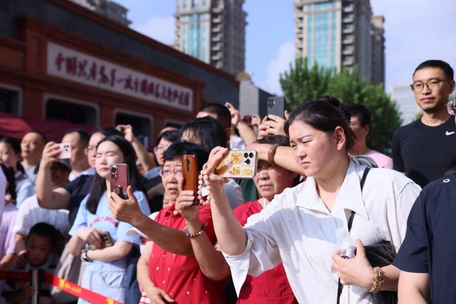 “向國旗——敬禮!”一大廣場上,國旗護衛隊升旗手振臂揚起國旗,國歌聲中全場肅立,注視着五星紅旗在19.21米高的旗杆上冉冉升起。