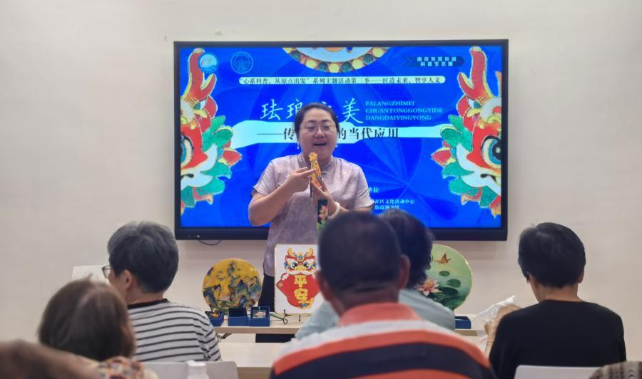如何通過傳統工藝與現代生活結合,豐富老年讀者的精神文化生活?非遺技藝傳承人李玲娣結合相關圖書講解歷史,“掐絲琺琅又稱景泰藍,起源於元代,盛行於明朝景泰年間,因其釉料顏色主要爲藍色而得名。”