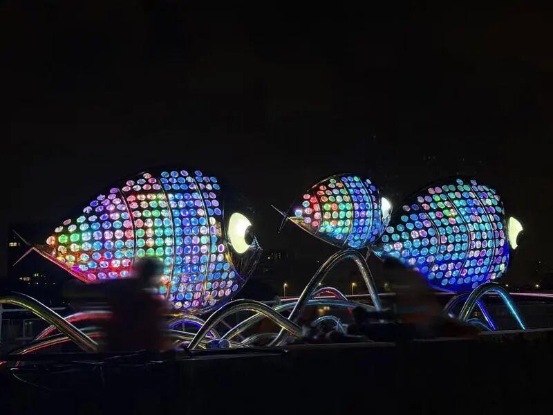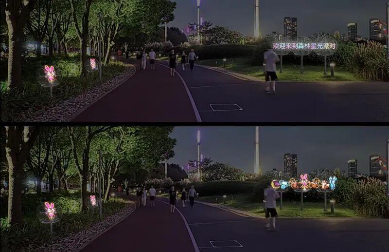 名爲“溯”的光之遊魚滾動着好奇的大眼睛在江畔“嬉戲”;以琴鍵爲靈感的“音躍森林”演繹唯美夢幻的音樂燈光秀;“長頸鹿”帶着“鼴鼠蹦蹦跳”陪你玩耍;小動物們藉助全息風扇技術,化身“光的信使”邀請你參加派對……