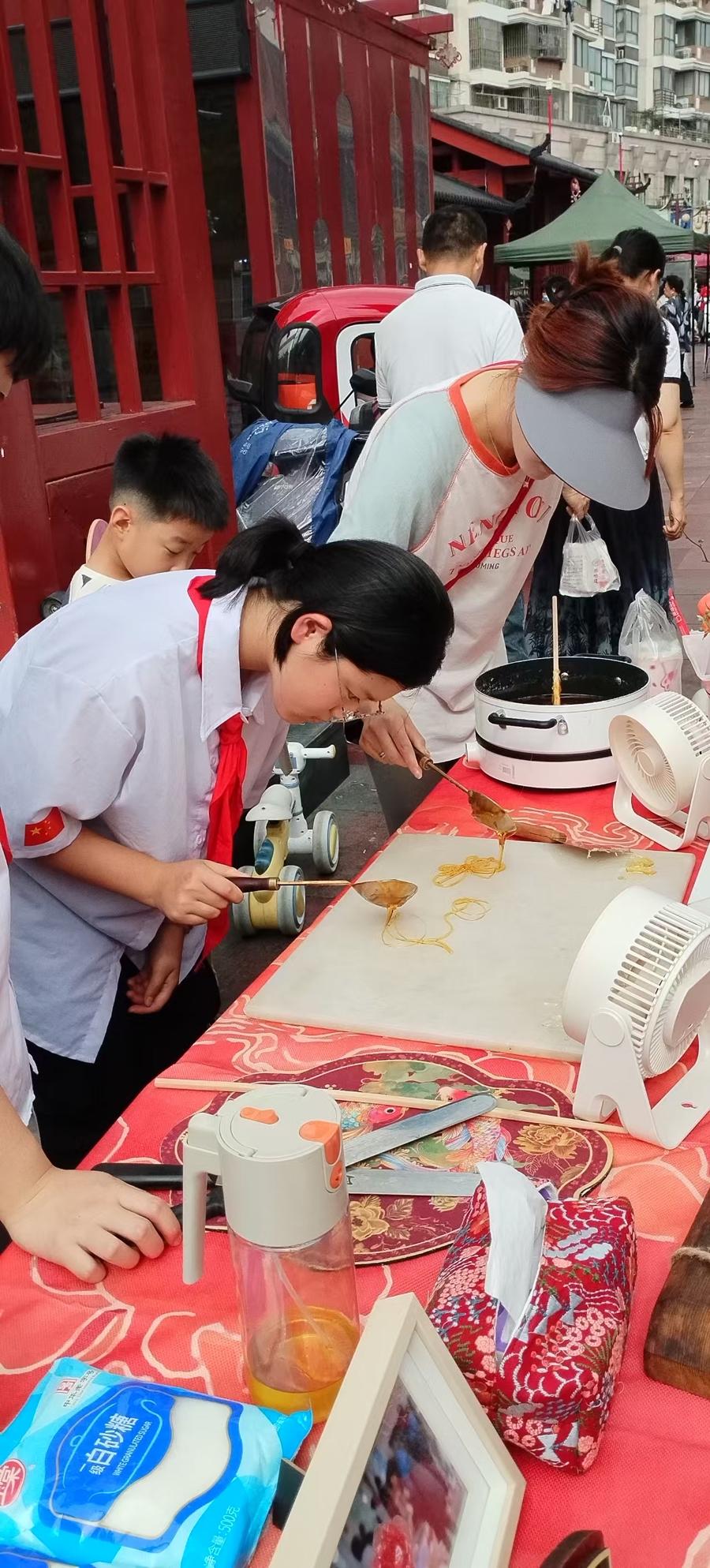 非遺糖畫不再是老藝人的天地,已悄然走向中學生的世界。上海周浦實驗學校於2016年2月成立了糖畫社團。一邊的展臺上插滿了剛完成的糖畫,有跳躍的金魚、展翅欲飛的蝴蝶等。學生正在劉燕林老師的指導下,在展臺前畫糖畫。4名學生分成兩人一組,一人負責熬製糖漿,另一人則舉着不鏽鋼勺,專心致志地用糖漿在光潔的石板上繪製出一幅幅晶瑩剔透的糖畫。該糖畫社團在傳承傳統糖畫技法外,還自主探究了“健康低糖糖畫”配方比例,自創了“彩色糖畫”“立體糖畫”。