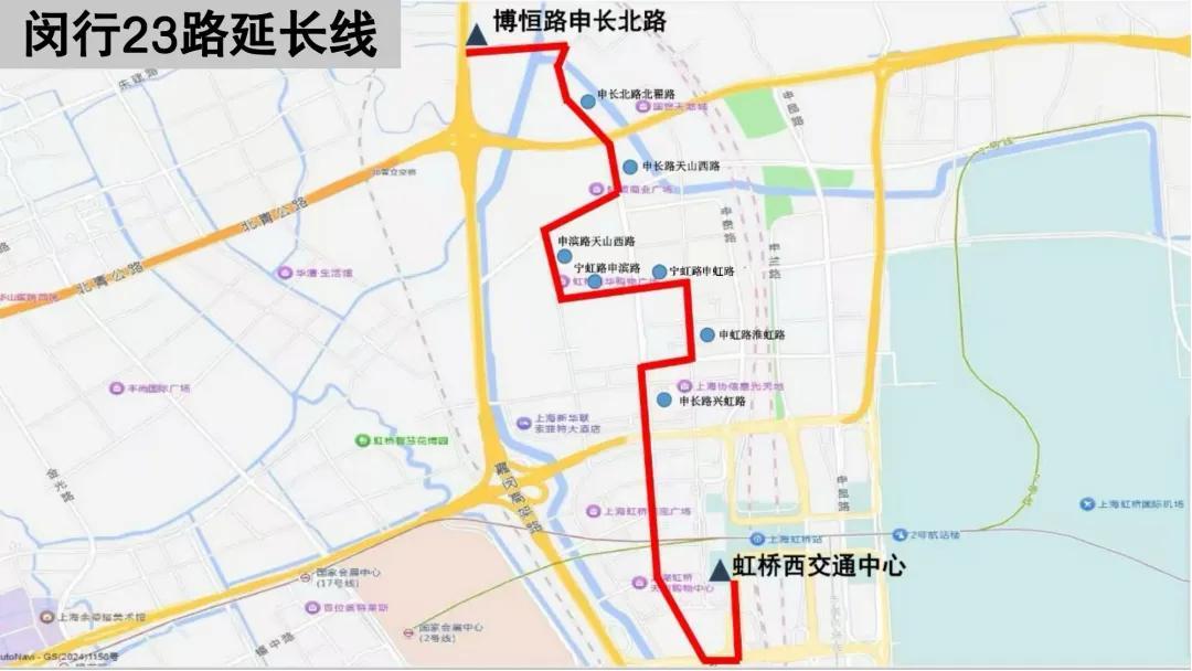 閔行23路延長線自虹橋西交通中心起至虹橋商務區止,經停申長路興虹路、寧虹路申濱路、申濱路天山西路、申長路天山西路、申長北路北翟路、博恆路申長北路。