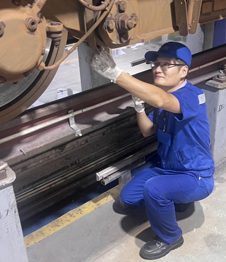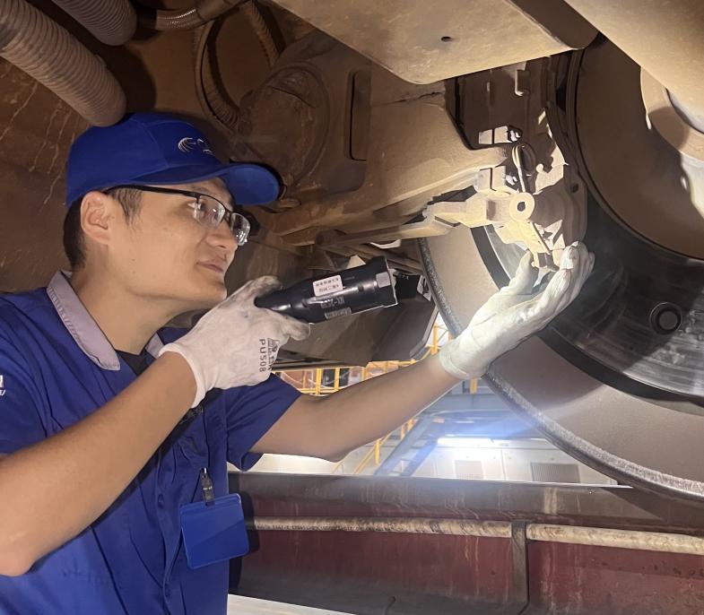 南翔動車所檢修二班副工長閆佳正在檢查動車組轉向架。