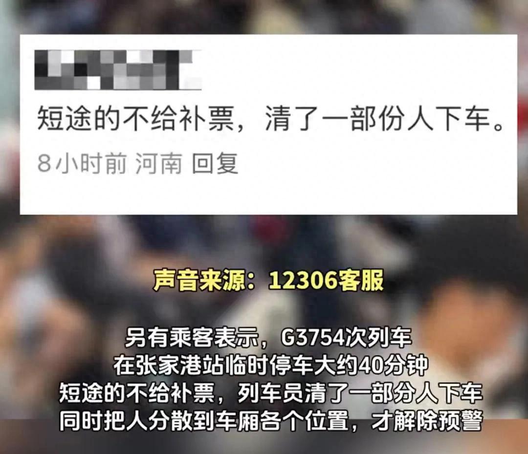 記者瞭解到,該乘客所乘坐的G3754次列車行至張家港站,因超員報警,列車臨時停站。G3754次列車由杭州西站始發,終抵呼和浩特東站,全程13小時30分鐘,中途停靠上海虹橋、常熟、鹽城、淮安東、徐州東、鄭州、太原南等25個車站。