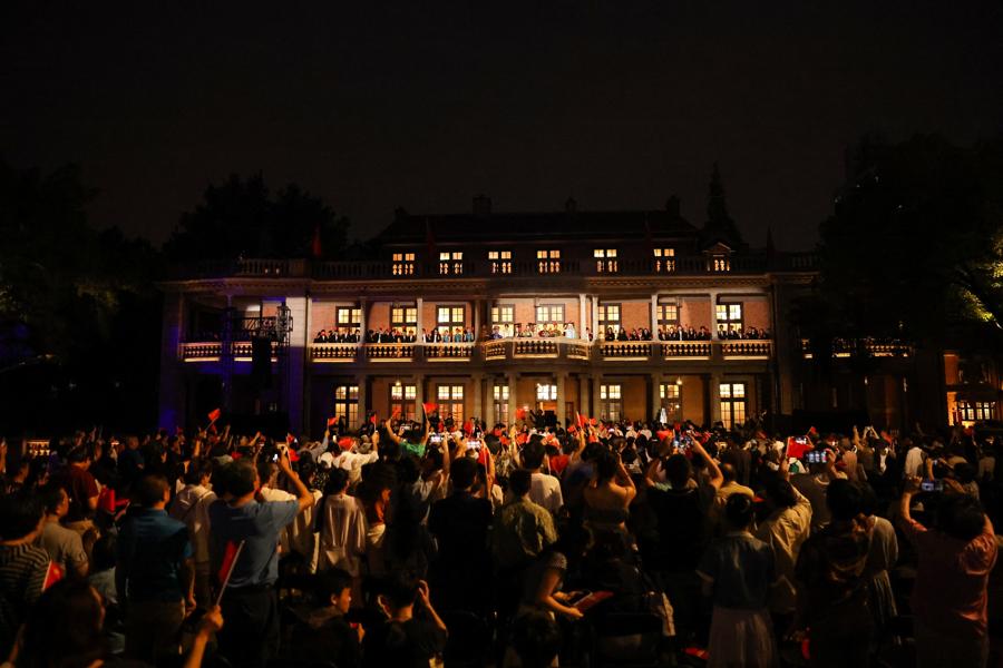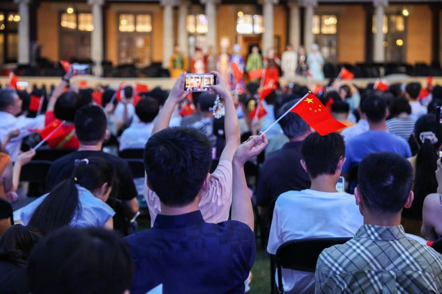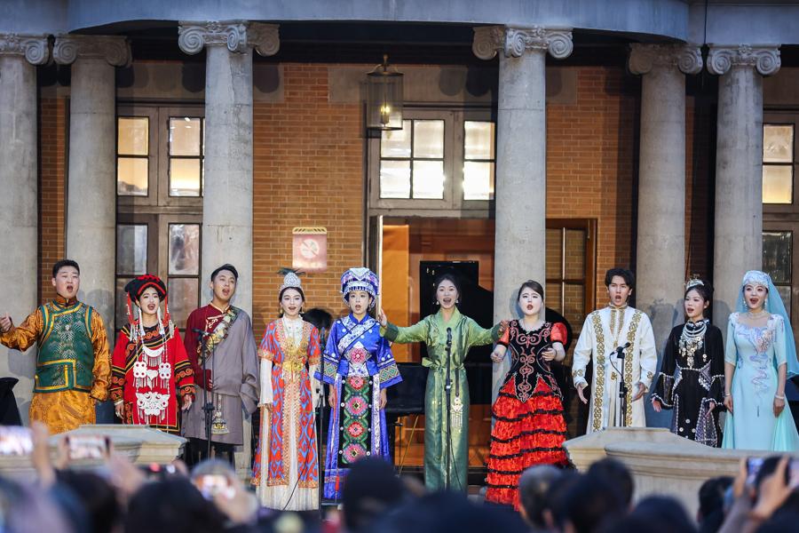 專業演出搬至戶外草坪,讓校園裏的百年建築與悠揚音符交織。二胡重奏《良宵》以婉轉旋律勾勒月夜靜謐,讓民樂之美自然融入城市秋夜。少數民族學生合唱《愛我中華》《唱支山歌給黨聽》,唱出各民族像石榴籽一樣緊緊抱在一起的凝聚力,也爲文旅場景注入多元文化色彩。來自果洛藏族自治州的上音少數民族學生麻切仁措表示:“看到觀衆席的笑臉,我確信藝術能直抵人心,凝聚各族人民的精神力量。”