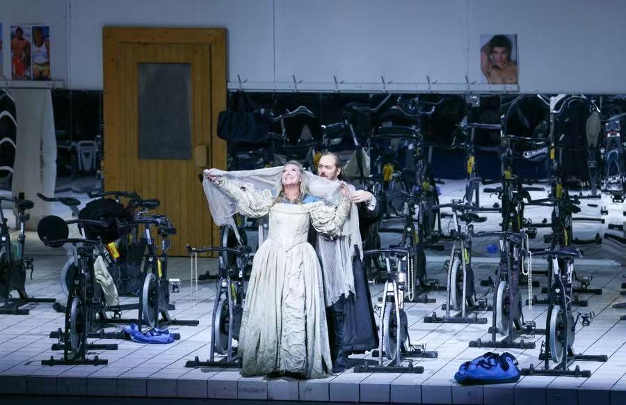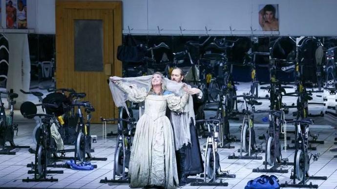 康維奇尼將挪威船員、紡織女、達蘭德(Daland)及其女兒森塔的生活場景拉至當代:第一幕挪威大船的現代舷梯、躺椅和小酒桌,第二幕的健身房佈景(內設動感單車、卷腹椅、體脂秤)和紡織女的運動裝扮,第三幕船員倚靠的吧檯……這些現代“物符號”爲觀衆理解瓦格納提供了直觀路徑。而第一幕中舵手對達蘭德船長的屈從,達蘭德爲錢財“賣女”、船員見錢眼開和盛宴狂歡,第二幕中紡織女對森塔的嘲笑,埃裏克對森塔“歇斯底里”的情感控制等情節,無不隱喻和諷刺着當今時代的“精緻利己主義”。這些現代元素,與荷蘭船隻古代的舷梯、珍藏的奇珍異寶、幽靈水手圍坐的長桌等形成強烈的衝突性對比,深化了作品的批判維度。