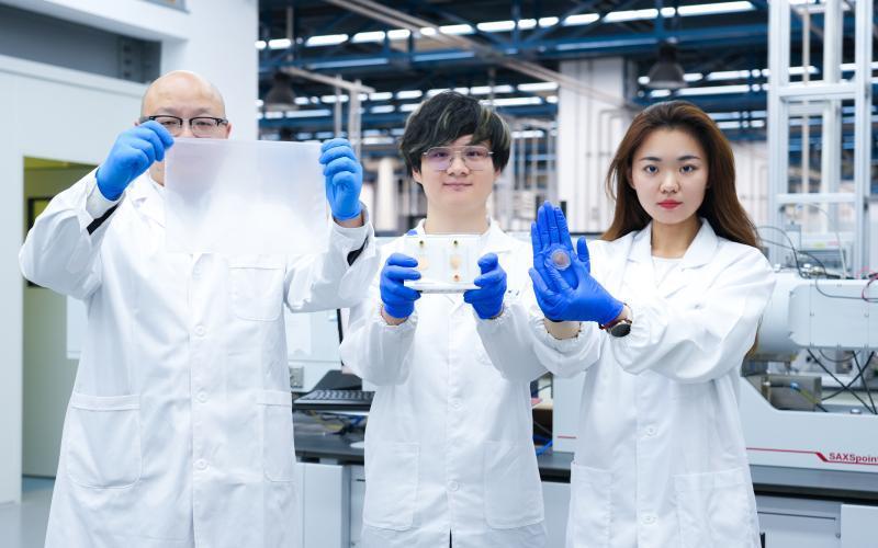 錢小石(左一)和學生一起展示高分子電卡薄膜,這也是登上《自然》的成果之一。