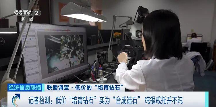 在浙江杭州黃金珠寶飾品質量檢驗中心,工作人員將記者在直播間內購買的兩枚單價在150元的號稱是培育鑽石的戒指進行了檢測。