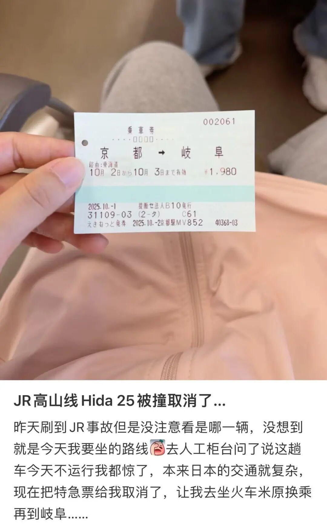 受事故影響,10月2日,日本部分列車處於停運狀態。另一位在日本旅遊的中國遊客陳小姐告訴記者,她們原計劃10月2日搭乘JR高山線從京都出發前往岐阜,但到達現場後,人工櫃檯工作人員稱該趟列車由於10月1日的事故停運。“今天是京都到名古屋段受影響,我們只好換別的車出行。”