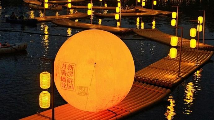 飯後賞燈,纔是重頭戲。蟠龍新天地的夜,是屬於燈籠與詩意的:涵春廣場的“玉兔窗籠”、程祠草坪的“海月茶亭”、煙雨廊橋上的“團圓兔”、香花亭的“香躍兔”,以及蟠龍灣的“月影游龍竹排燈”,蜿蜒水上,光影浮動,美得讓人屏息。