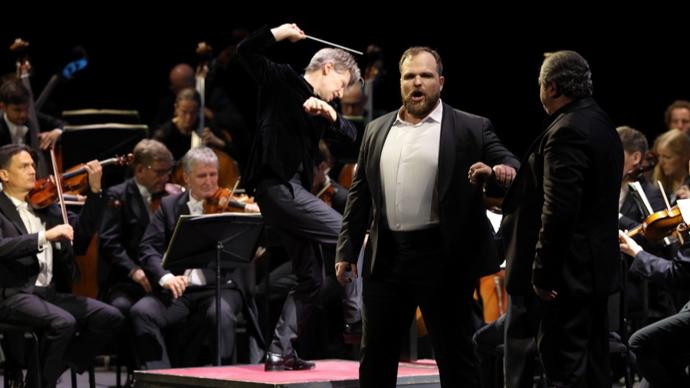 10月2日晚,開場鈴打響,巴伐利亞國家管弦樂團和巴伐利亞國家歌劇院合唱隊在上海大劇院舞臺就位,隨後,穿着黑色禮服的主演們也依次來到臺上。對比前一晚《漂泊的荷蘭人》有着導演明確表達意圖的舞美和演出調度,《奧賽羅》乍看起來是過於樸素的“站樁唱歌”。而這並非爲了方便巡演而作的減法。上海音樂學院陶辛教授無論在演前撰寫導賞還是演後發表觀感,他幾番強調:這部歌劇特別適合用音樂會的形式來演出,因爲這是一部聽起來特別過癮的歌劇,特別是心無旁騖地聆聽時,能夠徹底地體會到音樂的過癮之處。